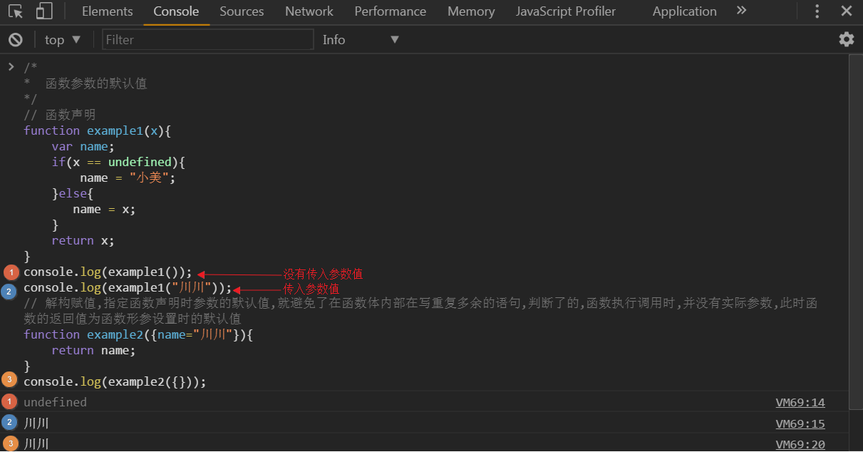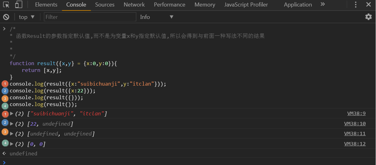 注意下面的一种写法与上面的区别,上面的是直接赋值,实际参数少于形式参数时,则会返回undefined,函数result的参数指定默认值,而不是为变量x和y指定默认值