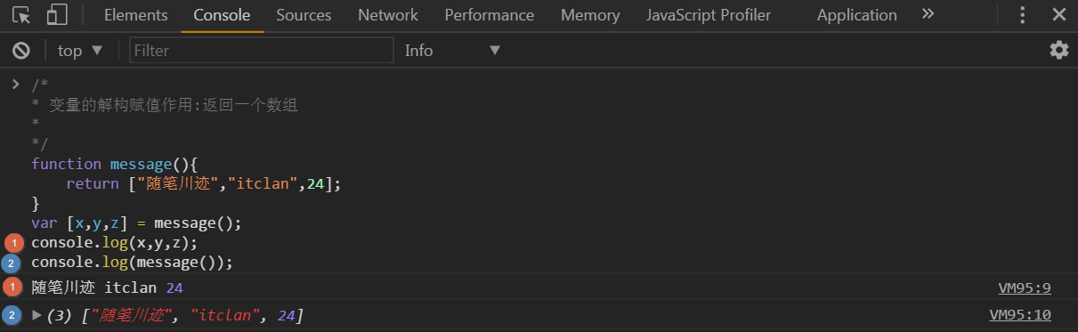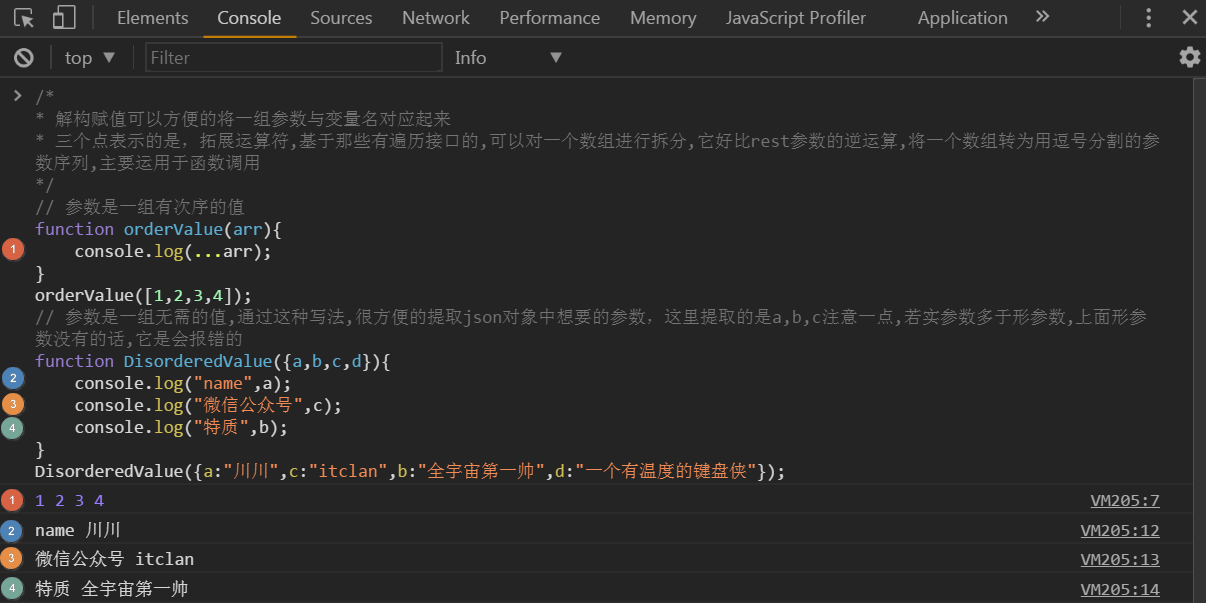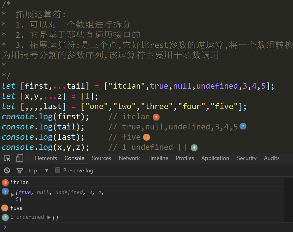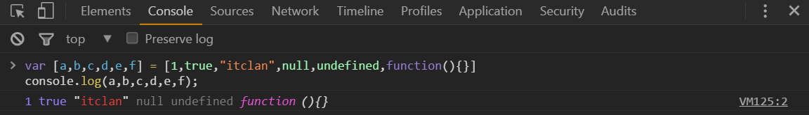 console.log(a,b,c,d,e,f); //1 true "itclan" null undefined (){}