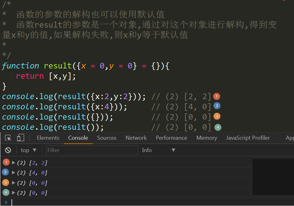 函数result的参数是一个对象,通过这个对象进行解构,得到x和y的值,如果解构失败,则x和y等于默认值