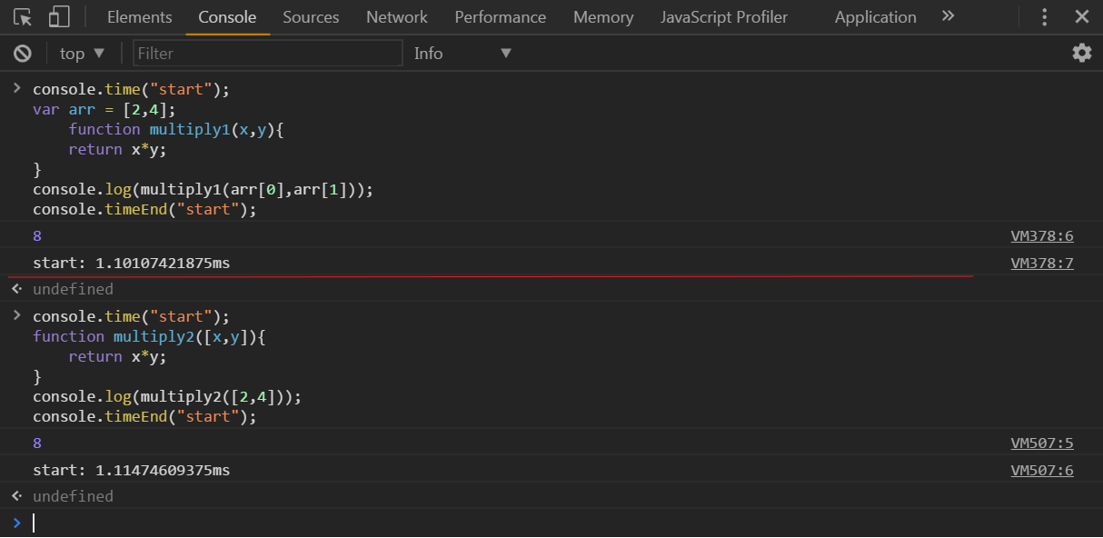 两者性能比较:执行代码所消耗的时间,从结果得出,前者要优于后者,后者只是一种代码书写的简化,后者消耗的时间长一点,小段代码性能差别并不是很大,不受影响,但是若是很多的话,也是影响性能的,因为它先要解构,在赋值嘛,语法糖虽新,简化了操作,必然牺牲性能,有得必有失,适用就好