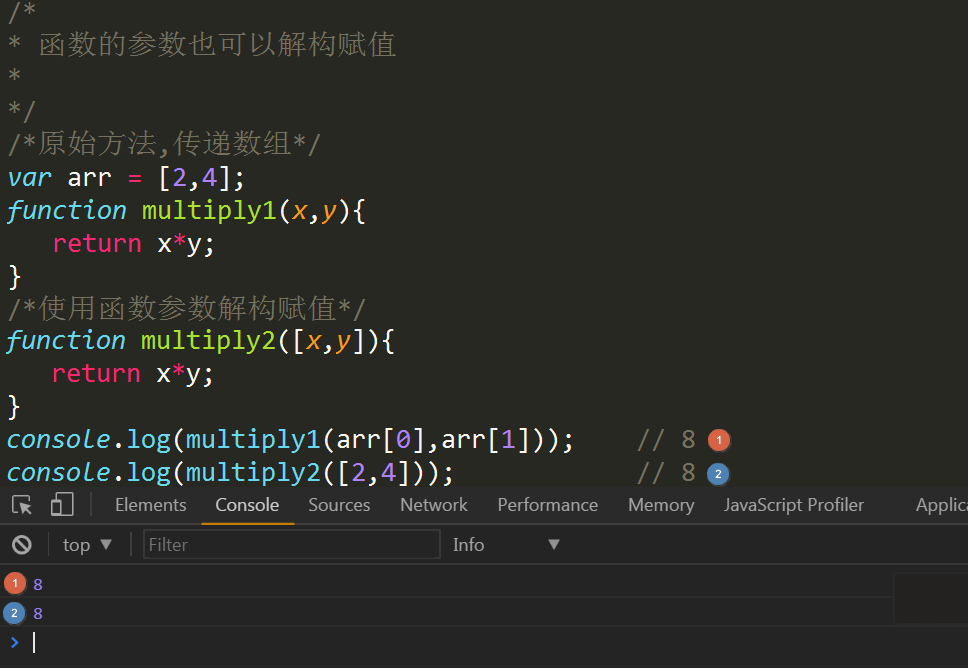 上面的两段代码分别是没有使用解构赋值,和使用了解构赋值,前一个呢,是通过函数直接传参的形式,后一个呢,你可以理解为将圆括号内作为整个参数,传进去,函数multiply2的实际参数并不是一个数组,而是通过解构得到的变量x,y