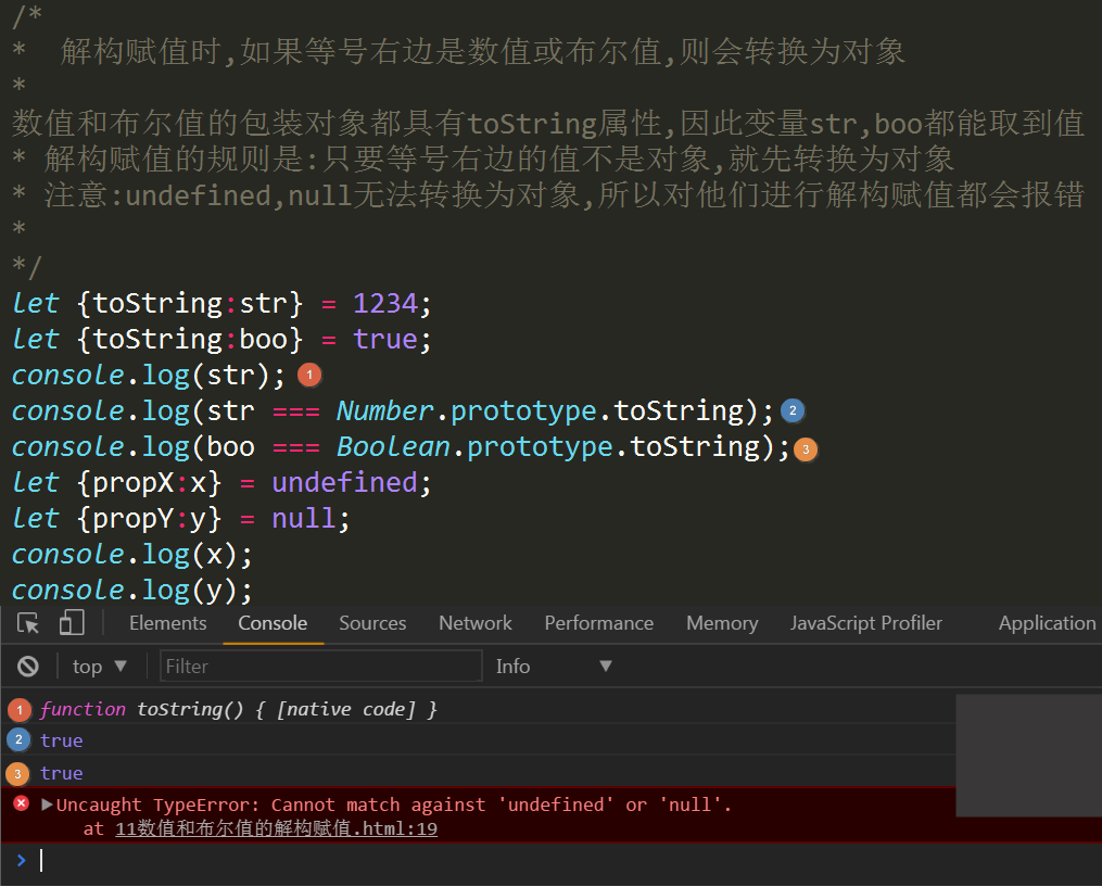 - 解构赋值的规则是:只要等号右边的值不是对象,就先转换为对象