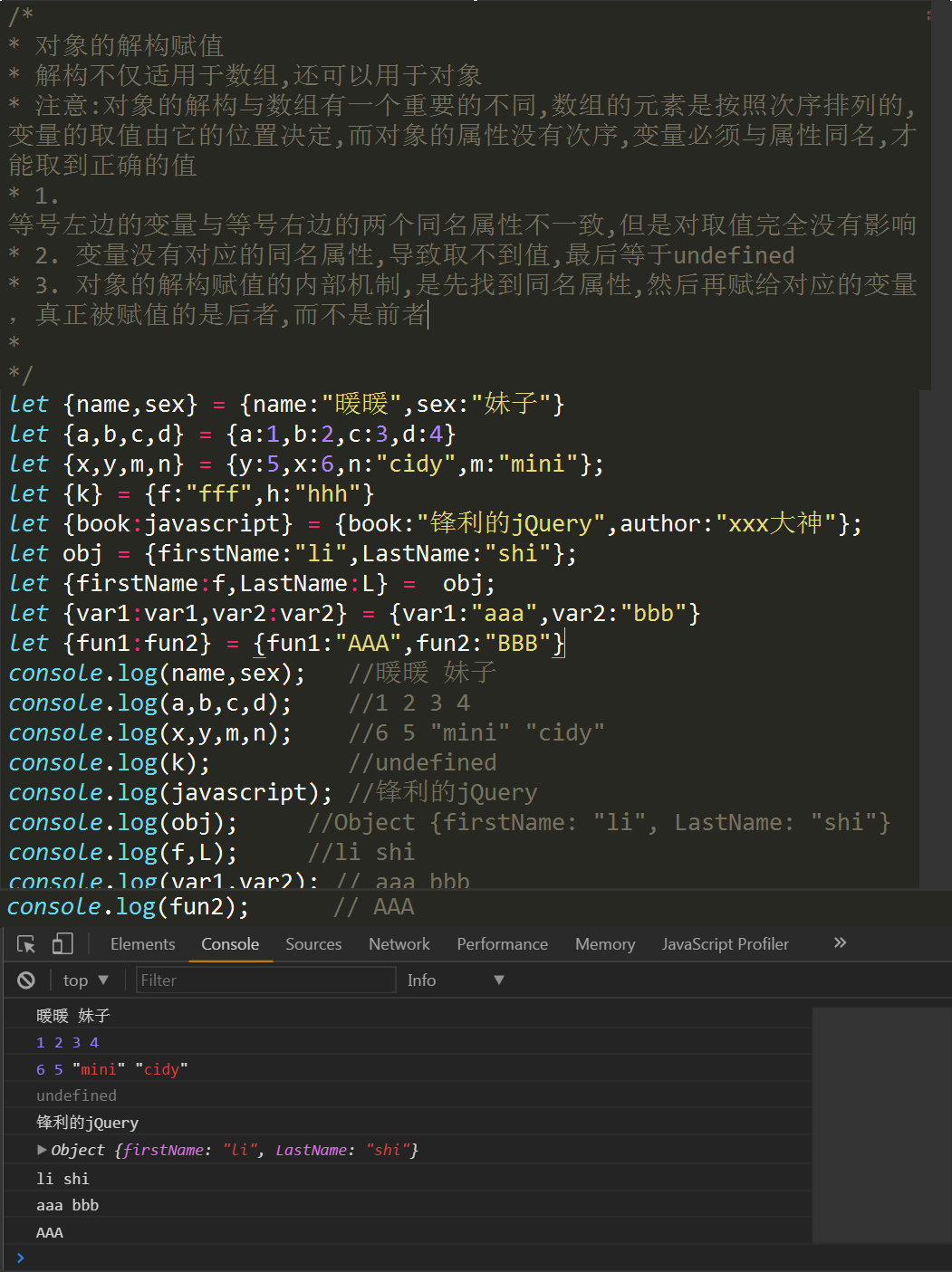 - 注意:undefined,null无法转换为对象,所以对他们进行解构赋值都会报错
