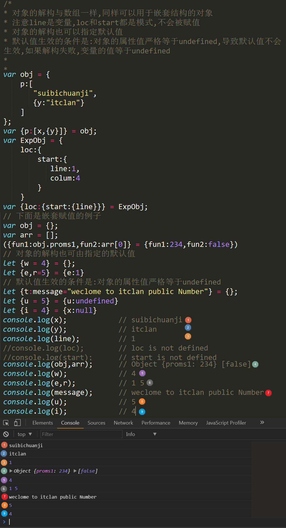 - 对象的解构赋值的内部机制,是先找到同名属性,然后在赋给对应的变量,真正被赋值的是后者,而不是前者
