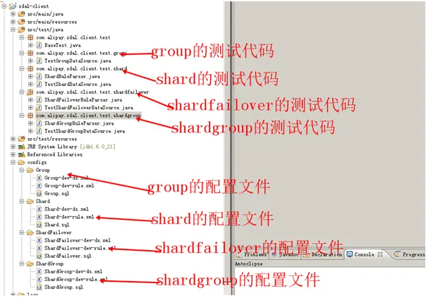 【代码示例】 示例代码中有group,shard,shardfailover,shardgroup 4中配置的功能测试代码,是基于mysql数据库的,相应的配置文件,分库分表静态类,建库脚本等也在里面: