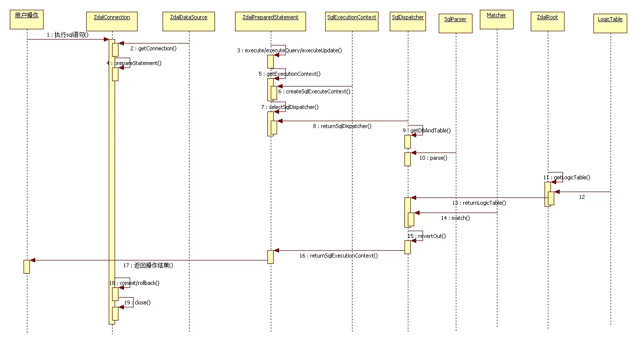 5.将传入的sql 和 参数进行包装后,调用 zdal-parser 和zdal-rule的 相关接口,进行sql的解析以及计算相应的分库分表结果。在此模块将会实现表名替换的功能,即将sql的逻辑表名替换成带后缀的物理表名。