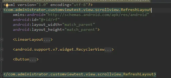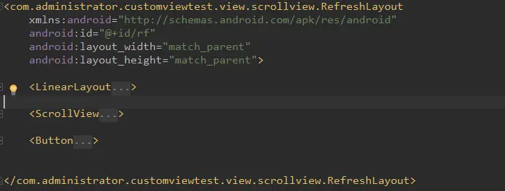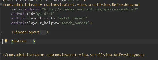 public RefreshLayout(Context context) { super(context); init(); } public RefreshLayout(Context context, @Nullable AttributeSet attrs) { super(context, attrs); init(); } public RefreshLayout(Context context, @Nullable AttributeSet attrs, int defStyleAttr) { super(context, attrs, defStyleAttr); init(); } private void init() { addHeadRefresh(); } private void addHeadRefresh() { setOrientation(LinearLayout.VERTICAL); ProgressBar progressBar = new ProgressBar(getContext()); addView(progressBar, 0); } - 通过scroll隐藏progerssbar。