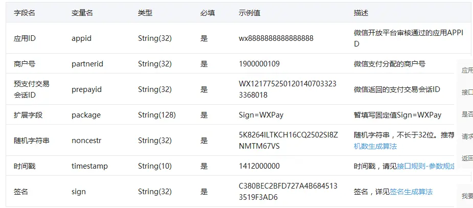 在我们自己的APP中点击微信支付按钮后,我们首先要请求一个我们自己服务端的接口,这时服务端需要走统一下单的逻辑,然后将一些参数返回给我们。这里需要注意,严格来说的话,这个接口应该返回如下所有参数: