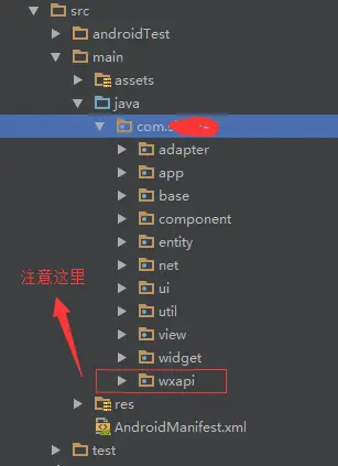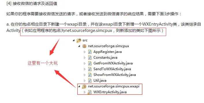 先看官方文档,仔细理解下图被框住的文字。第一次做微信支付被这句话坑惨了,搞了两天都TM找不到我到底错在哪里了,现在想起来就生气。所以这句话的正确解读是:在你的包名下一级目录里面,新建一个文件夹名字为wxapi。而不是像下图一样有两个并列的net.sourceforge.simcpux。