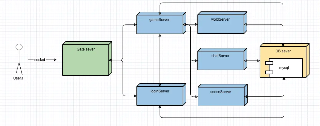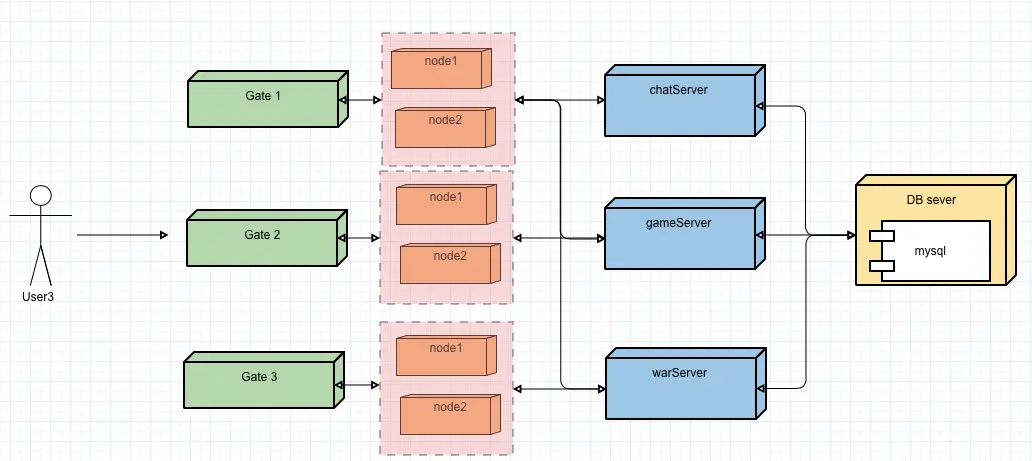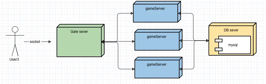 网关部分分离成单端的gate服务器,DB部分分离为DB服务器,把网络功能单独提取出来,让用户统一去连接一个网关服务器,再有网关服务器转发数据到后端游戏服务器。而游戏服务器之间数据交换也统一连接到网管进行交换。所有有DB交互的,都连接到DB服务器来代理处理。