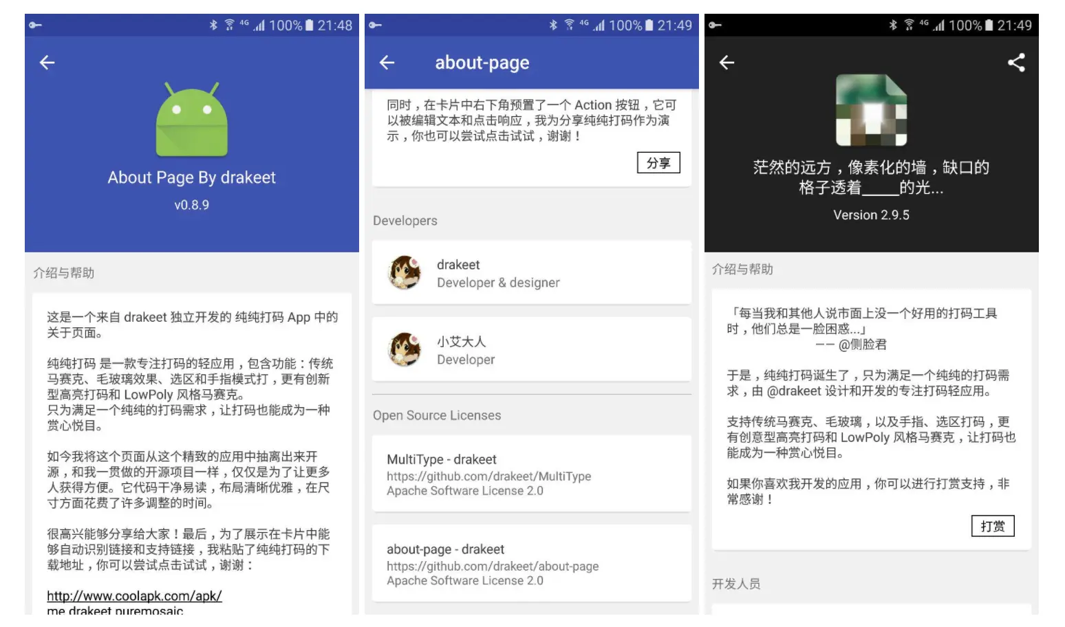 一个 Material Design 的关于页面,核心基于 MultiType,包含了多种 items,美观,容易使用。