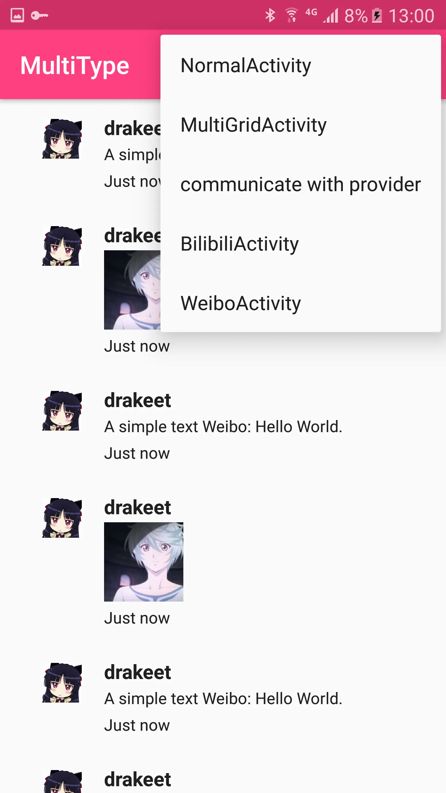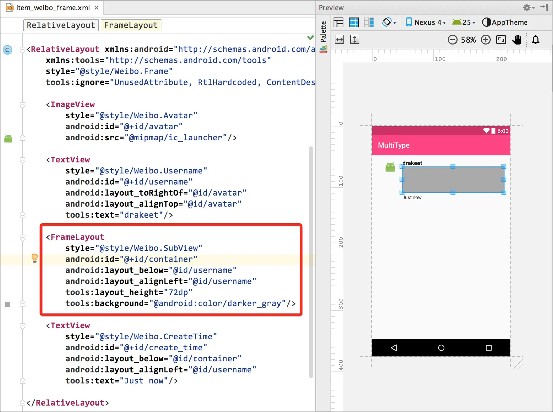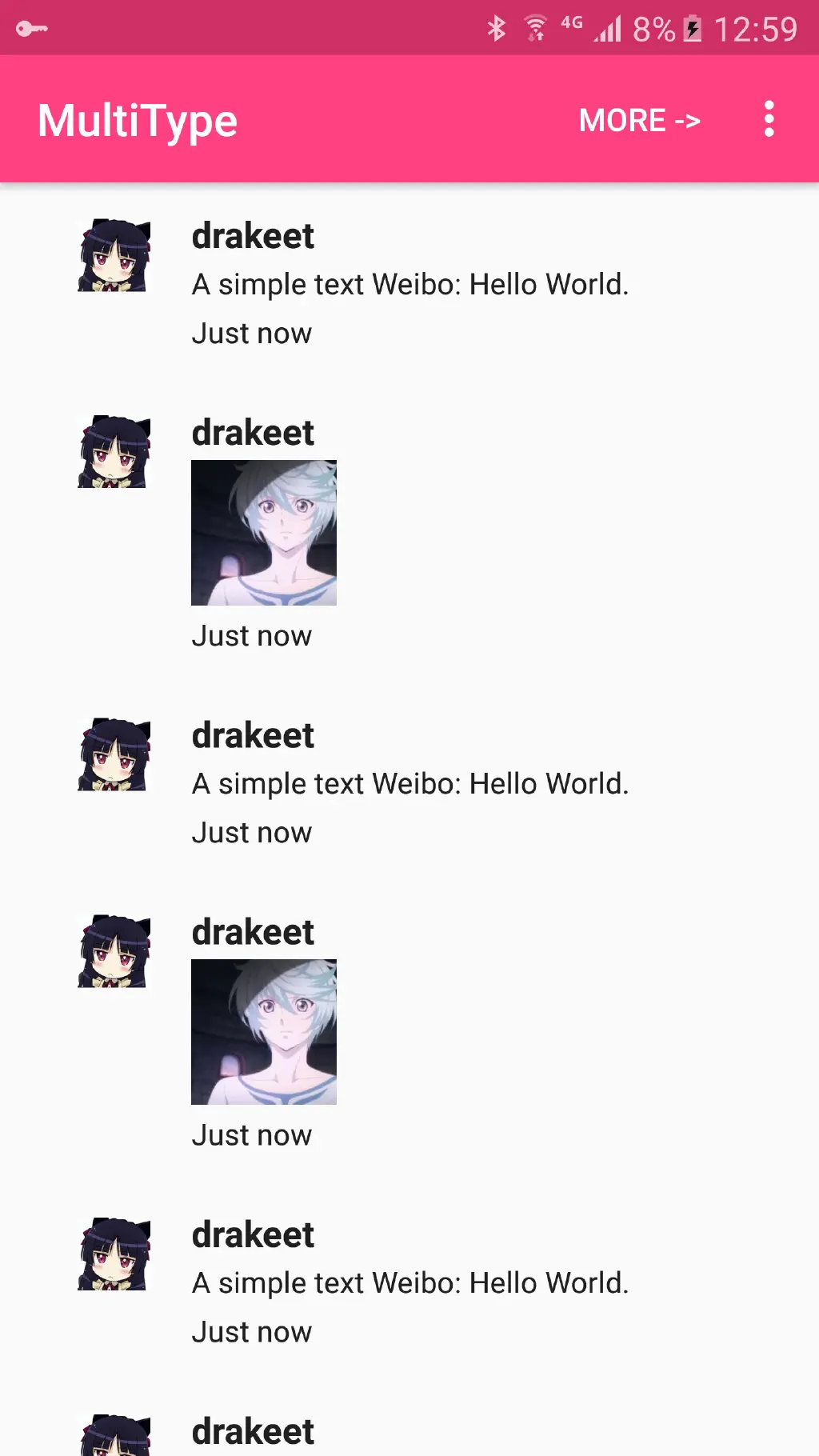 frame布局可以看出来,它内部有一个FrameLayout作为container将用于容纳不同的微博内容,而这一层框架则是共同的。这个例子算高级中的高级,但实际上也是很简单,展示了 MultiType 优秀的可拓展能力。完整运行结果展示如下: