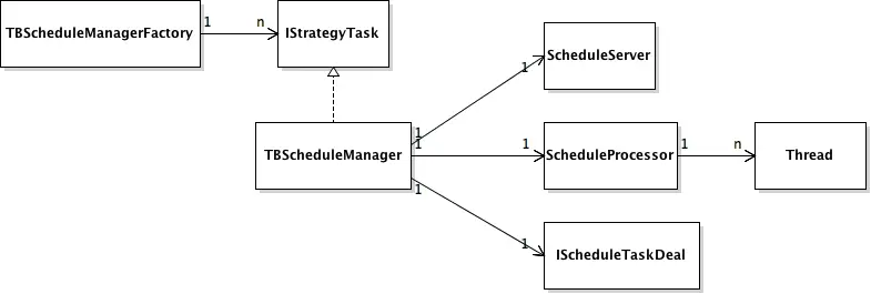 一个Factory处理多个strategy,每个strategy下有多个IStrategyTask对象。TBScheduleManager实现IStrategyTask接口,一个TBScheduleManager实例跟ScheduleServer、ScheduleProcessor、IScheduleTaskDeal的关系都是一比一的关系。ScheduleServer是针对某一个task的的调度器。IScheduleTaskDeal是我们自己代码里需要实现的任务对象。ScheduleProcessor是处理任务的多线程任务处理器,代表一个线程组。可以包含多个线程,线程的最大数量取决于后台配置的task身上的threadNum字段。