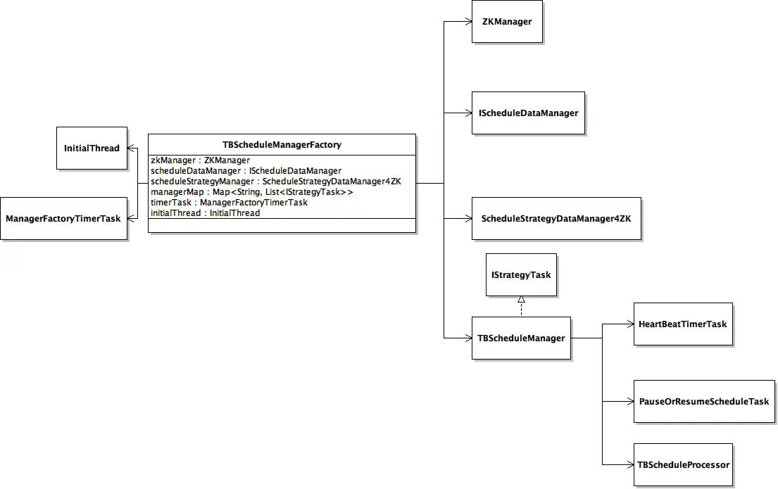 TBScheduleManagerFactoryfactory实例对象,管理这个factory内部所有的事情。ZKManager负责与zk之间的连接,数据交换。IScheduleDataManager负责/app1/baseTaskType及其子节点所有数据模型维护。ScheduleDataManger4ZK负责/app1/factory``/app1/strategy及其字节点数据模型维护。IStrategyTask每个实例代表一个线程组,每个strategy可对应多个IStrategyTask实例,来真正处理配置的任务。