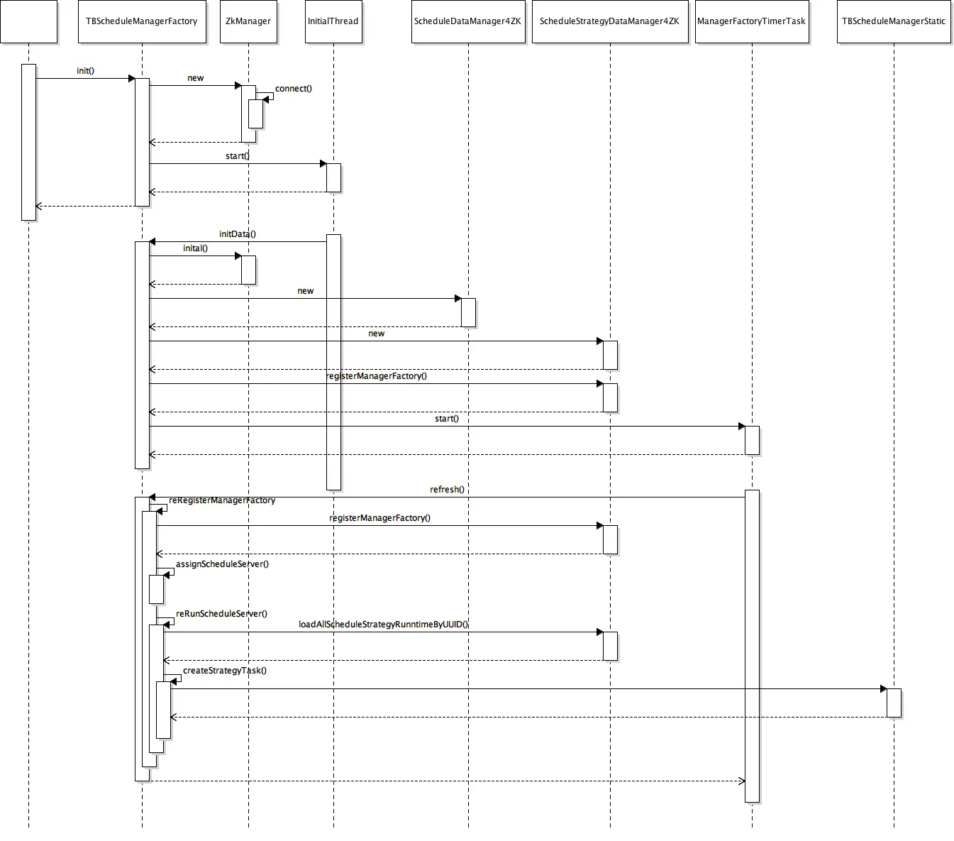 ManagerFactoryTimerTask#run()中,而主要的逻辑集中在TBScheduleManagerFactory#refresh()。这里不去关心stop factory的逆向流程,只来看正向流程,见TBScheduleManagerFactory #reRegisterManagerFactory。 -