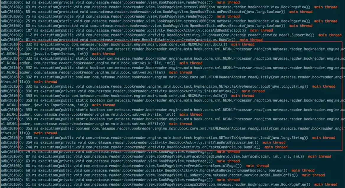 if (consume > 40 && Thread.currentThread().getId() == BaseApplication.getInstance().getMainThreadId()) { // 方法耗时大于40毫秒,并且当前线程是主线程,则直接打印当前方法的签名