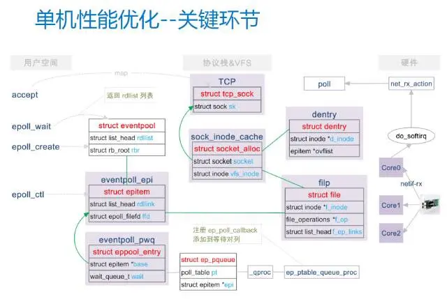 操作系统方面需要根据实际的物理内存大小调整相关的文件句柄数和内存分配数。协议栈方面考虑使用用户态的协议栈替换系统自带协议栈,消除频繁的系统调用和内存拷贝带来的额外处理开销。最后是选择一个好的server框架,使用无锁的共享内存进行进程间消息通讯,业务处理进程采用基于epoll的协程模型,既能降低开发业务逻辑的难度,又能避免采用多线程模型带来的系统上下文切换带来的性能损失。