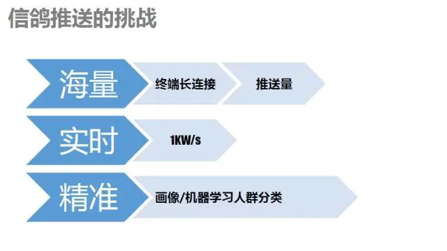 对于其它的一些应用来说,也有各自的推送的诉求。比如说对于一些新闻类的应用,时效性要求非常高,需要每秒千万级的推送速度,另外一些应用则需要在达到运营目标的前提下,希望尽量减少对用户的骚扰,即精准推送。