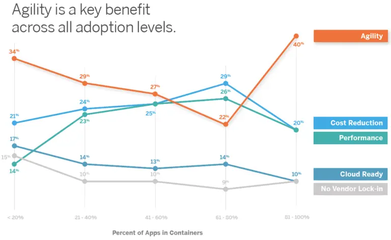 无论用户是刚刚才开始采用容器技术(小于 20% 的容器化)还是已经成功上路,对他们来说,敏捷性几乎都是最为重要的因素。但是在容器化程度达到 61% 到 80% 的企业中,对性能和成本控制的要求都超过了敏捷性。从直觉判断,虽然成本控制和性能提升不是催化剂,但是在企业心中成本和性能也是最后选择容器技术重要的考虑因素。另外一个原因可能是因为用户大规模采用容器技术( 61% - 80% 的水平),这些用户已经开始关注成本控制和性能提高所带来的优势了。