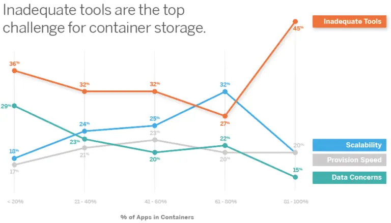 当用户完全采用容器技术(81% - 100% 段)时,没有充分的存储工具将带来巨大的挑战,包括速度和可扩展性。很明显,所有的其他问题都很重要,但对容器来说,缺乏足够的存储工具是最重要的。