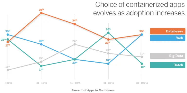 但是,从一开始,团队就采用有状态的工作负载。参与调查的人中少于 20 %的容器使用者已经开始尝试(容器化)数据库、批处理和某种程度的大数据工作负载。而在 21% 到 40% 和 41% 到 60% 段中,对于数据库进行容器化占据了所有容器化工作量的最大份额。