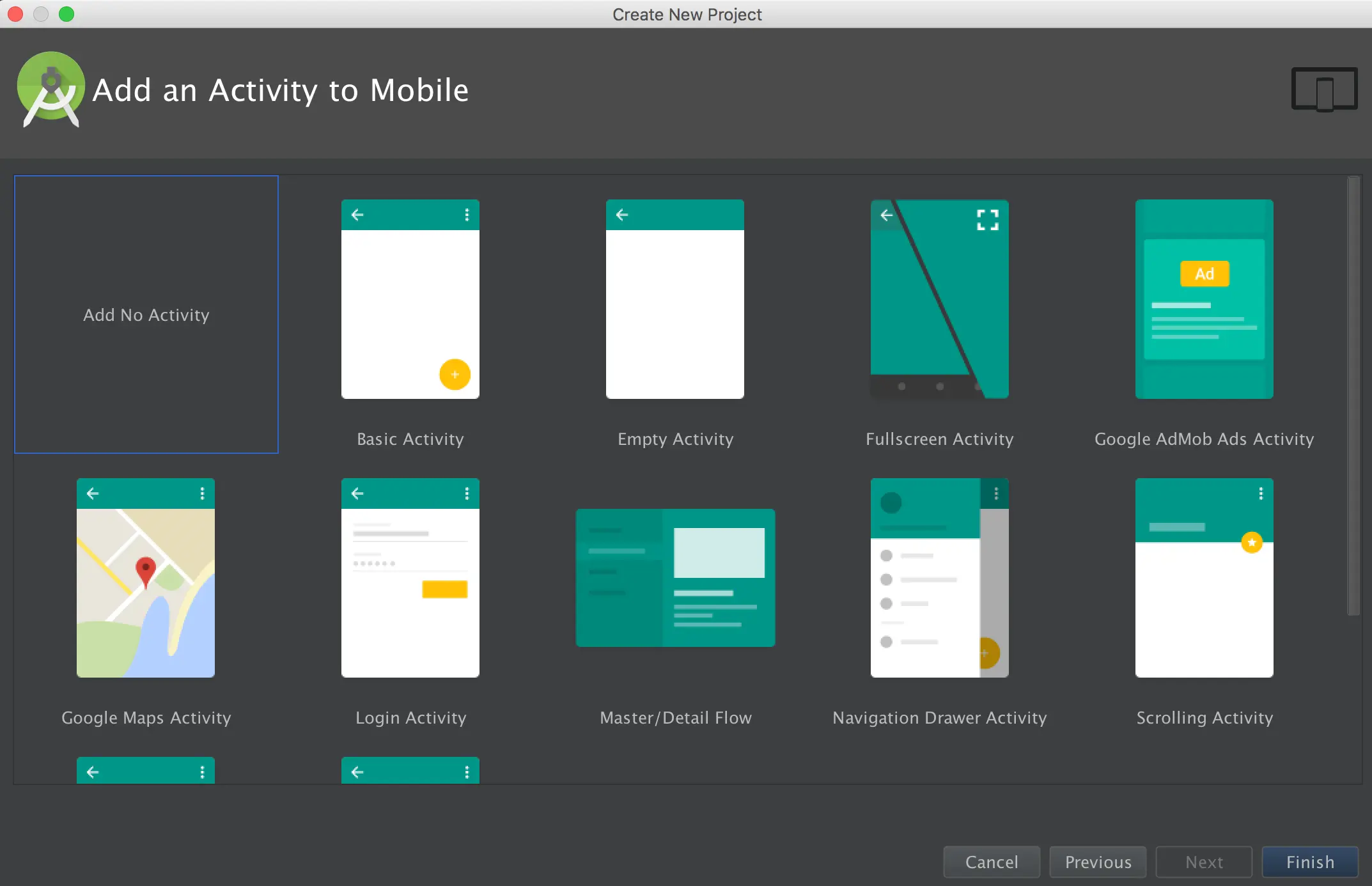 在我们创建项目时,在最后一步可以选择一种预设的 Activity 作为项目的第一个 Activity,如下图