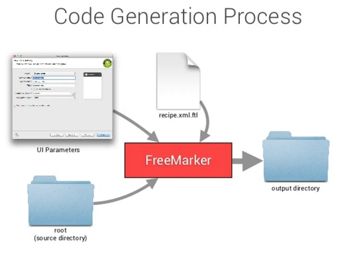 这就是 Android Studio Template 的初次登场。Android Studio Template 依靠 FreeMarker 引擎,将事先定义好的模板文件生成我们所需的 class 文件、layout 文件等等,可以极大减少样板式代码的编写。