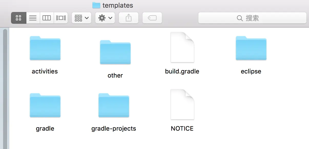 打开 Android Studio 的安装目录,进入到模板所在的文件夹。关于模板位置,Windows 的路径在 /plugins/android/lib/templates/,Mac 下是 Android Studio.app/Contents/plugins/android/lib/templates/。可以看到,默认已经实现了一些模板。