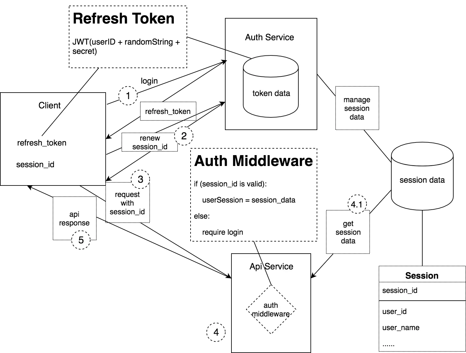 最终方案图示如下图,其中包含四个主要组成:Client客户端(e.g. 浏览器),Auth Service,Api Service 以及 这两个 Service 共用的 Session 数据。这些端之间的交互主要分以下五点(同图示序号):