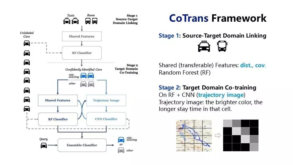 最后一个应用是和上海汽车做的研究,汽车在跑的时候能否根据它的路况分析车到底做什么?是共享还是私用的?我们很荣幸得到了一些数据,在这些数据里面我们可以同时进行两种分析,一种是图像分析,虽然我们本领域没有太多的标注数据,但是可以借用出租车来学习。左边的是同时做两个任务的学习,第一个是根据现在出租车的数据,来帮助我们标注互联网汽车的数据,但是这个当中可能会有错误,所以我们在本领域可以用一些图像分析来矫正这些错误,校正完再拿回来拓展这样的一个样本集。在这两个之间进行多次往返以后,我们就会得到一个很靠谱的模型,最后这样的一个算法我们就可以得到一个很不错的迁移效果。