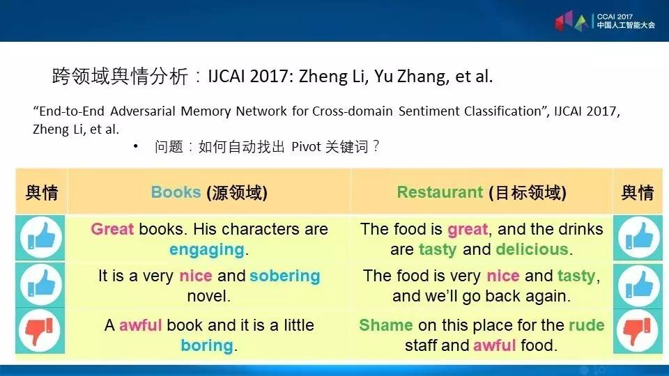 但是过去做迁移工作的时候,需要有一个概念叫Pivot,两个领域之间共享的关键词,这两个关键词对于指出这个是正向和负向也是非常有用的,像Great这个词,Boring和Awful,以前完全是靠人找到这两个词,我们知道这是不靠谱的。