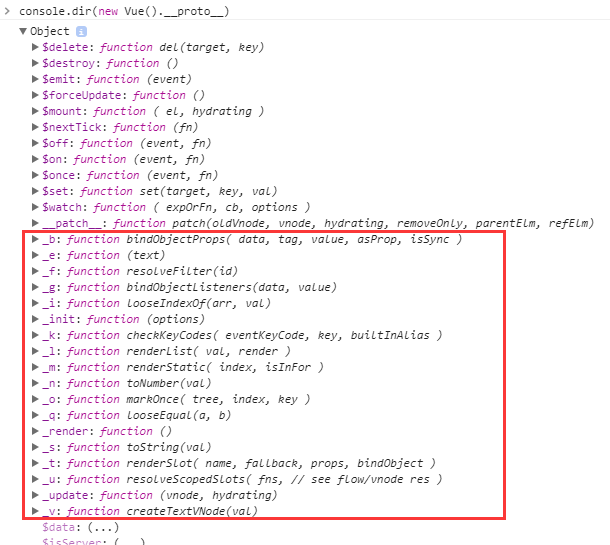 仔细观察编译后的 render 方法,和我们自己写的 render 方法有很大区别。但是仍然可以直接配置到 render 配置选项上。那么里面的那些 _c()、_m() 、_v()、_s() 能调用?随便看一个 Vue 的实例的 __proto__ 就会发现: