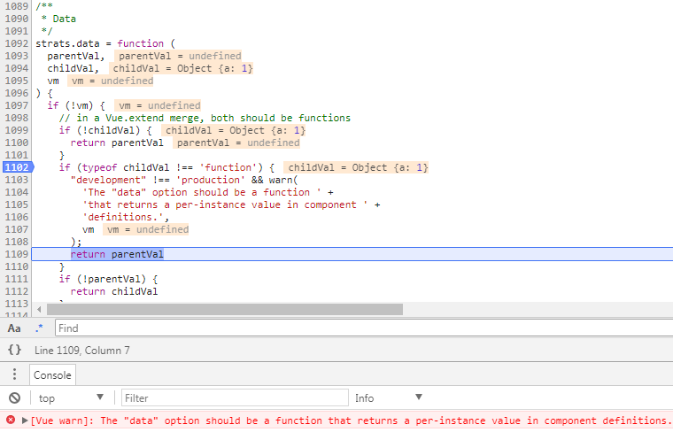传入非function类型的data(上图中data配置为{a:1}),在合并options时,如果data不是function类型,开发版会发出警告,然后直接返回了parentVal,这意味着extend传入的data选项被无视了。
