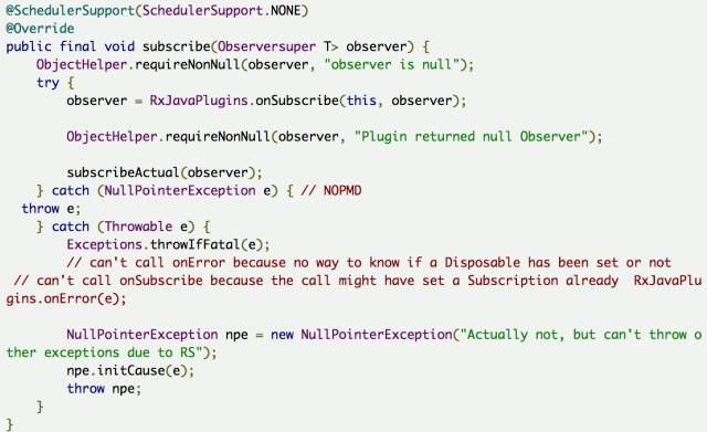4、被订阅者或者说被观察者(source)调用subscribe订阅方法与观察者发生联系。这里进行了异常捕获,如果subscribe抛出了未被捕获的异常,则调用 parent.onError(ex);