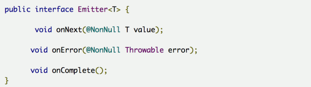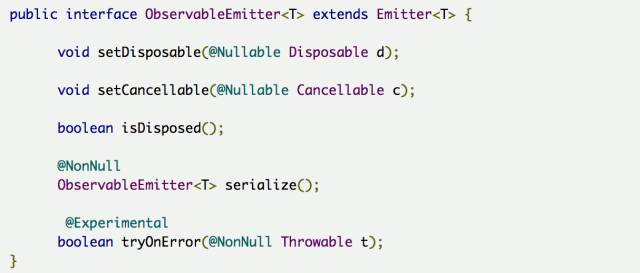 ObservableEmitter是对Emitter的扩展,而扩展的方法证实RxJava2.0之后引入的,提供了可中途取消等新能力,我们继续看Emitter