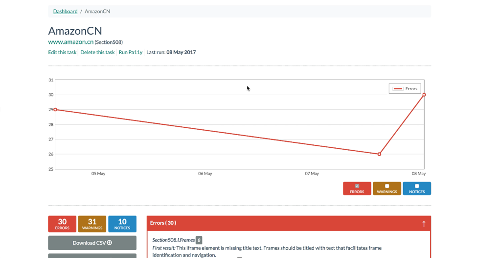Pa11y-Dashboard还提供可视化图表,协助分析质量趋势。