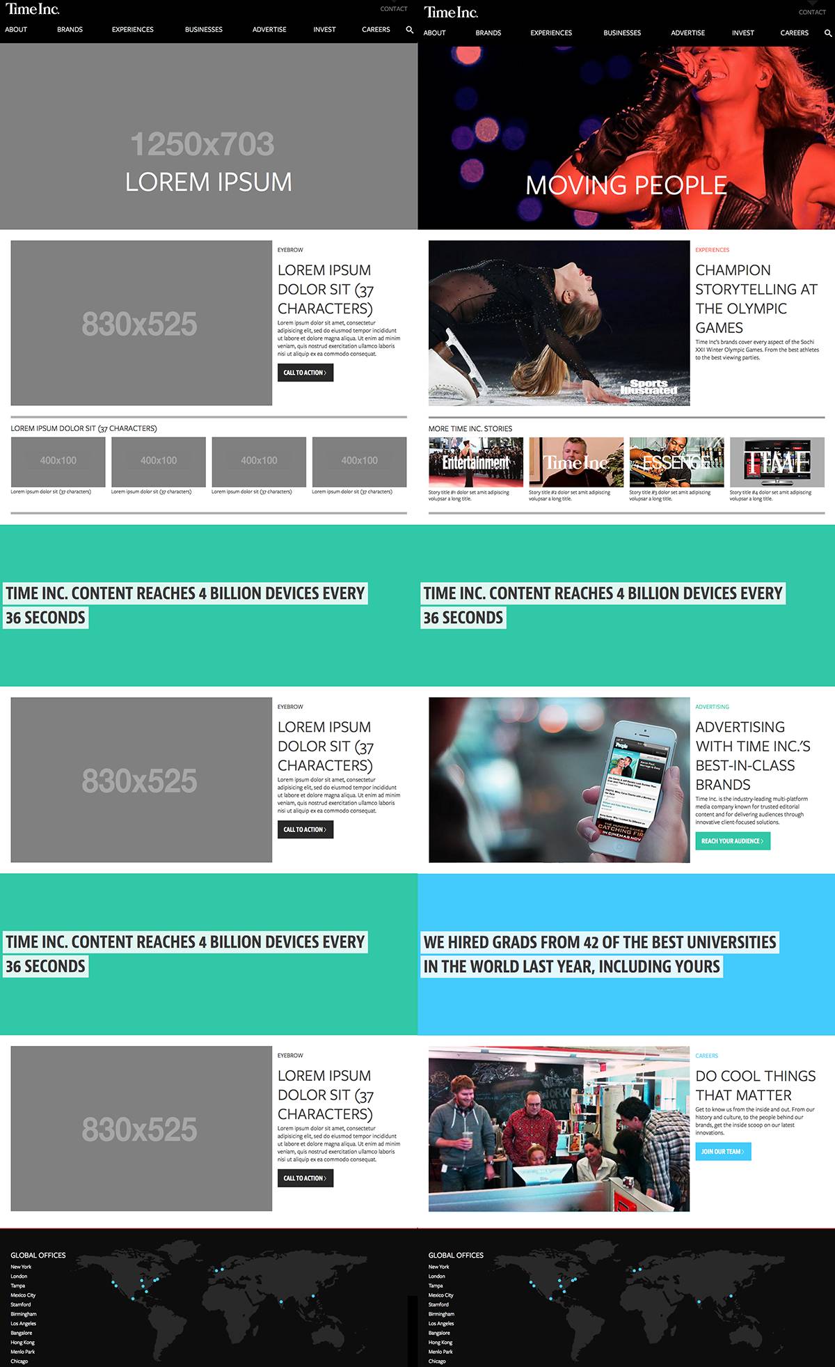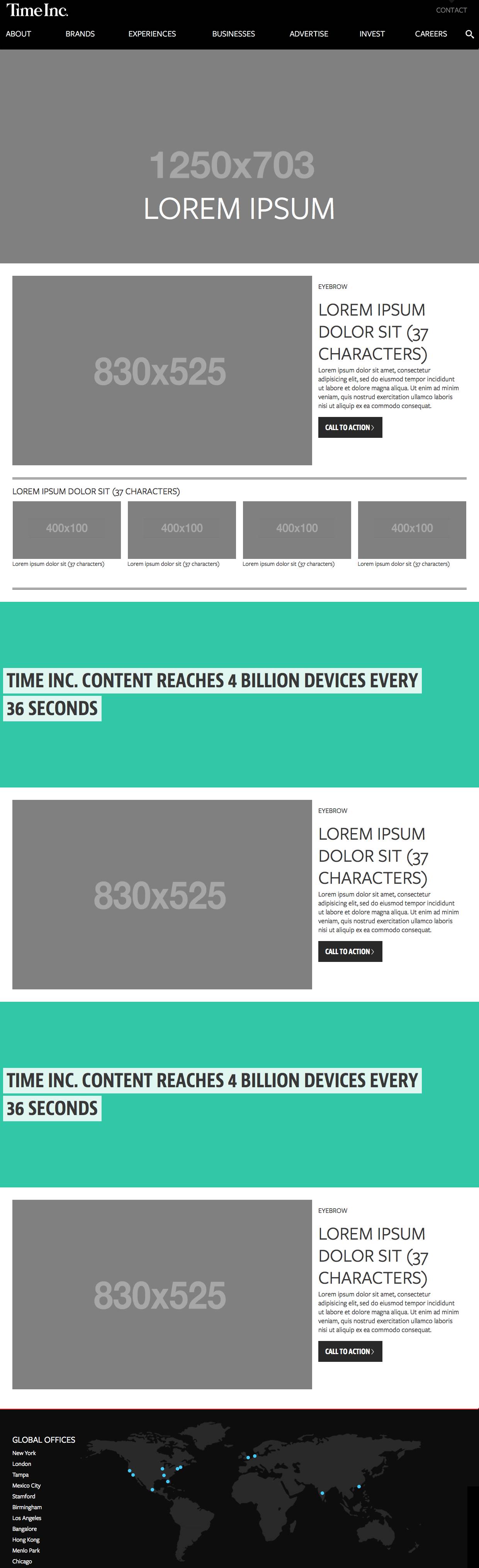 Time Inc. 的主页模板包含少量可重复 patterns:一个全局标头,一个主题图片,少量区块 (包含图片,标题,摘要和 call to action 按钮),一块含有4个栏目的区域,一个仿真地图以及一个全局页脚。