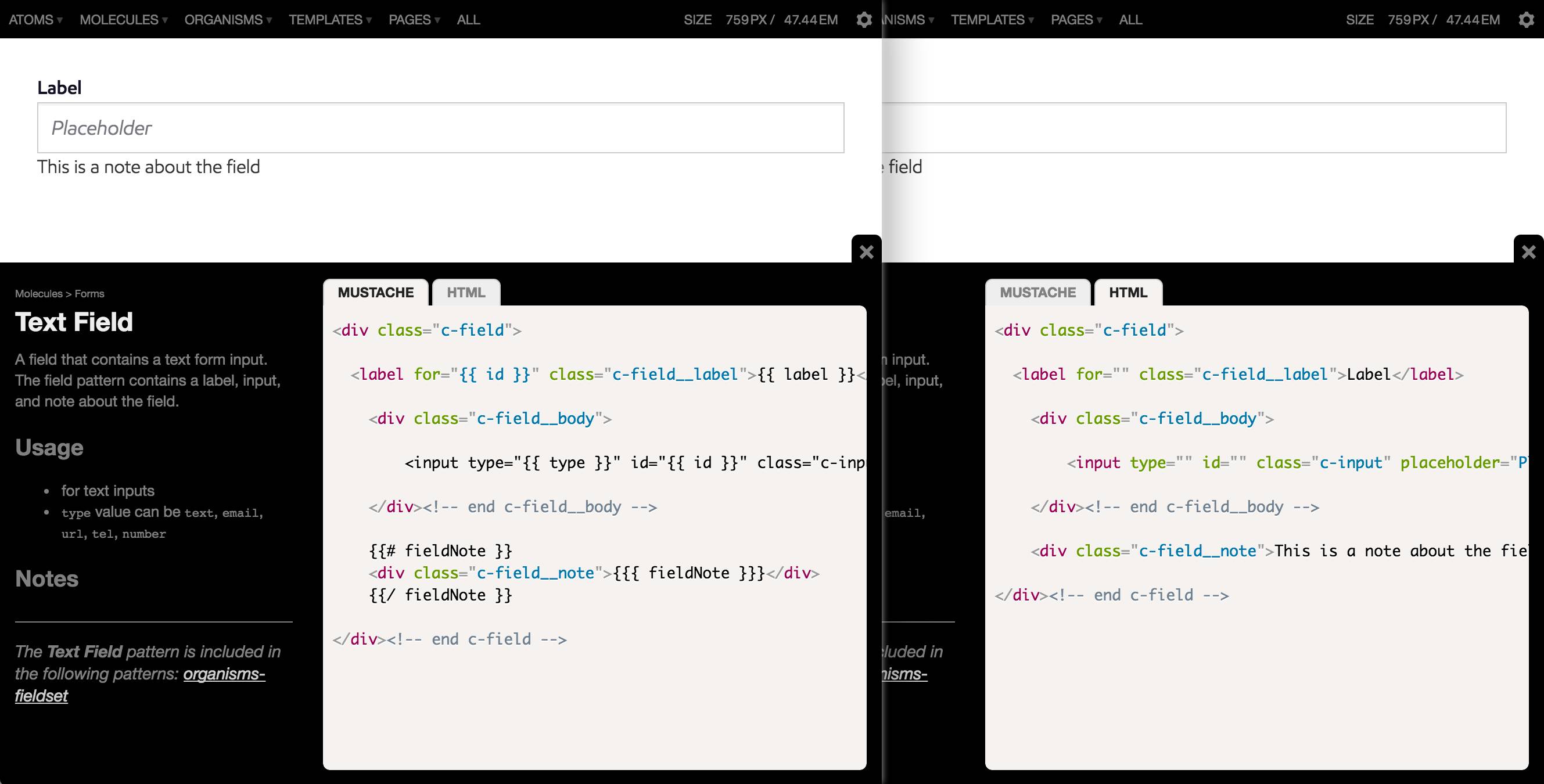 Pattern Lab 在线示例旁边展示了重要说明文档,有助于团队沟通