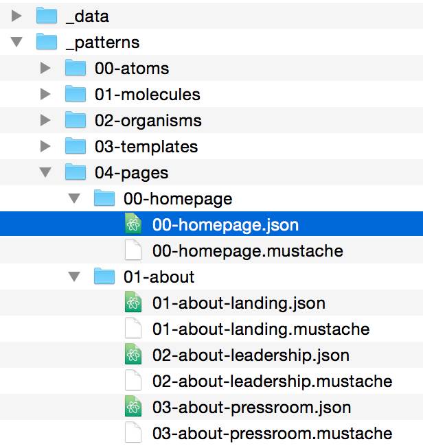 构建了一个点对点的CMS (内容管理系统)。分别创建默认的和特殊页面的数据就形成了一个点对点内容管理系统。像之前提到的,静态设计工具不足以应对动态的数据,不过为了展示界面变量而安装 WordPress, Drupal, 或者其他 CMS 又显得牛刀杀鸡。Pattern Lab 在这二者之间取得平衡,它允许团队工作中引入动态数据,又不必部署一个夸张的 MySQL 数据库。