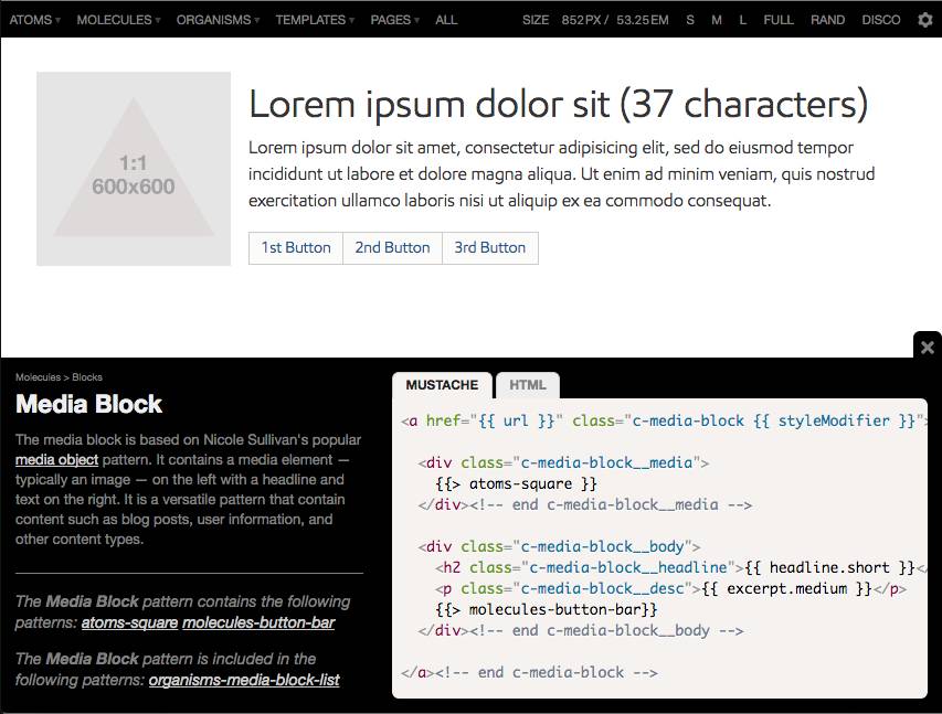 在上图的例子中,有一个叫 media-block 的分子 pattern,包含图片,标题,文本和一组按钮。通过模式沿袭可以看到,它包含一个叫 atoms-square 的 pattern,这是一个缩略图大小的图片,就好比 molecules-button-bar 是一组按钮。我们也可得知这个模式最终被用在哪里: media-block-list 组织中。