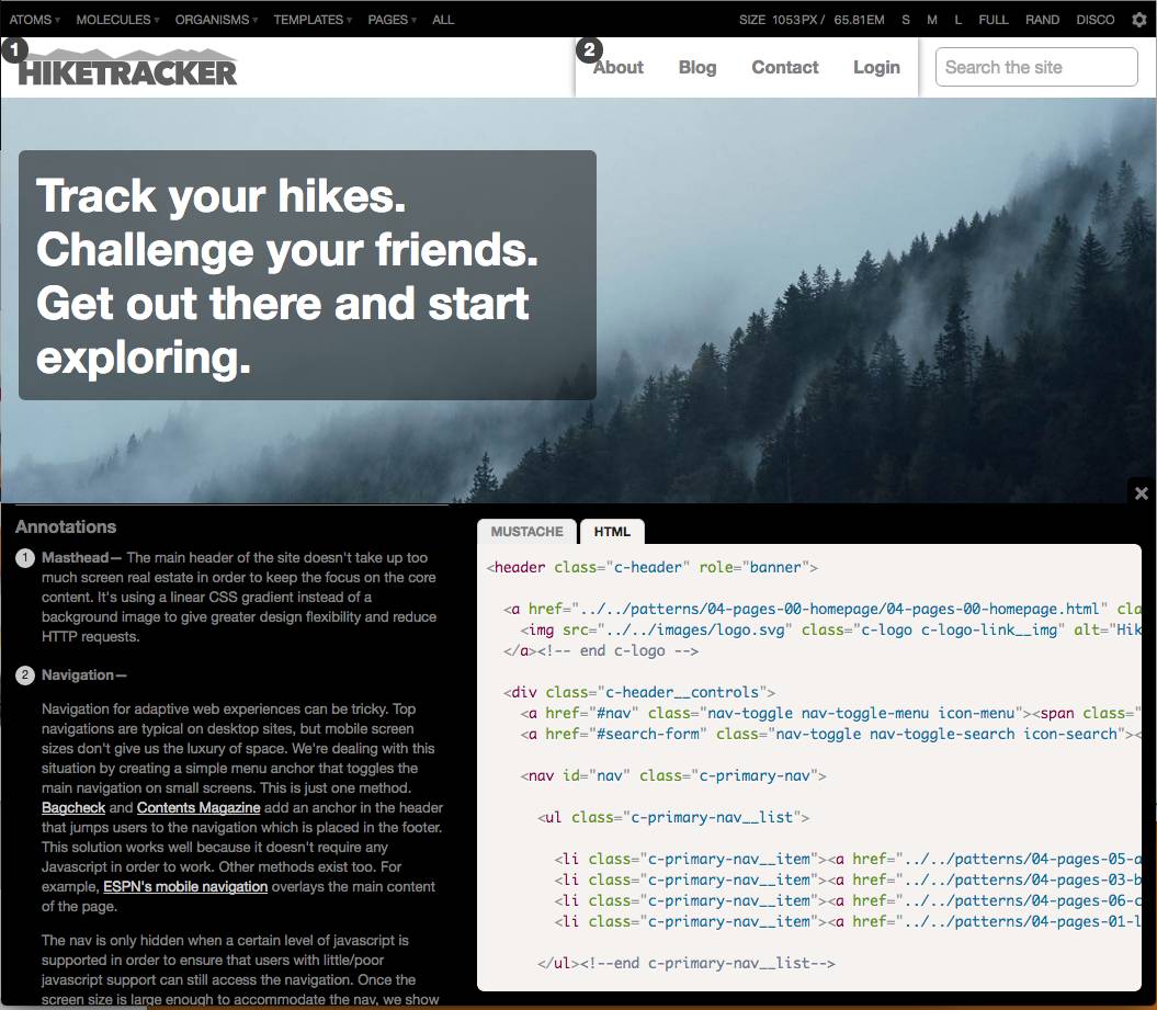 Pattern library 的一个常用功能就是查看构成特定组件的底层代码。显示出 pattern 代码加快了开发速度 (我爱死复制粘贴了,程序猿都爱,真的),还可帮助团队 leader 贯彻代码风格和样式规范。当茫茫多程序猿都在公司开发部门工作时,这个功能收益极高。
