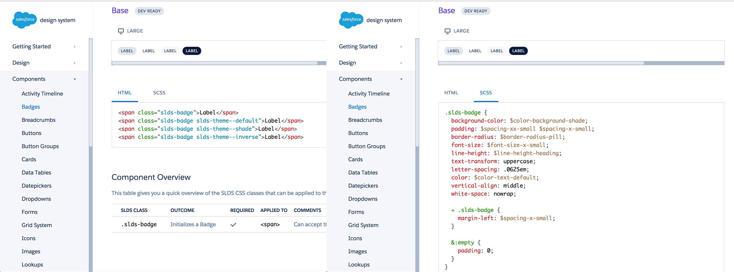 Salesforce 的 Lightning 设计系统展示了界面组件的 HTML 和 SCSS 代码。