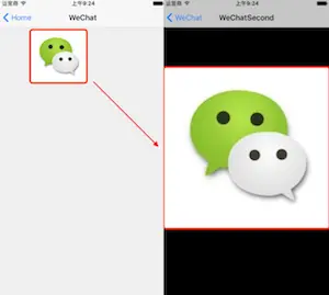此案例其实和案例三的实现方式基本一致,单从转场角度来说,不同点可以有两个:(1)转场前ImageView的frame不定,案例三中ImageView的frame就一个(2)转场后的位置跟案例三不同