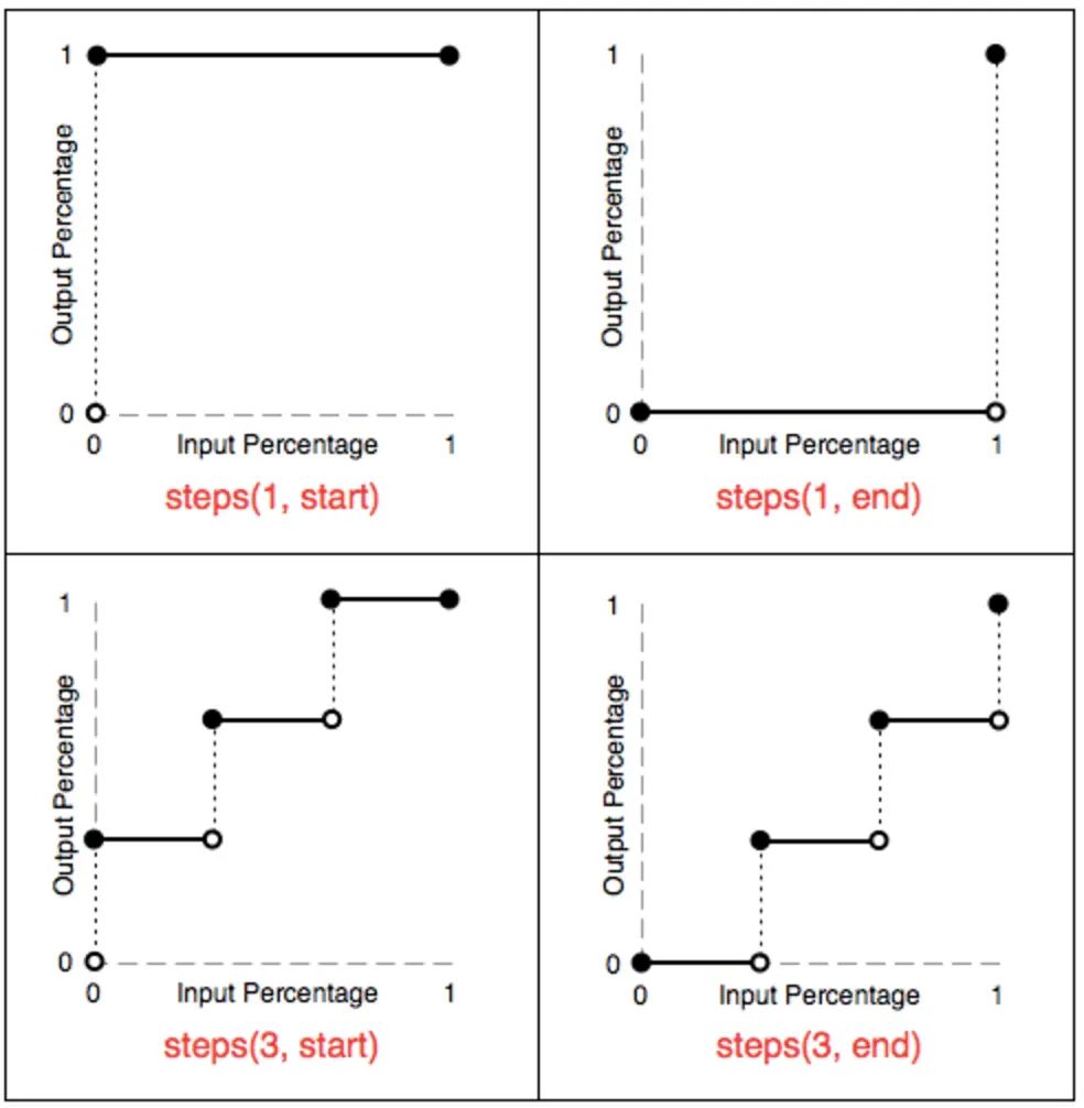- steps(1,start): 动画一开始就跳到 100% 直到这一帧(不是整个周期)结束 == step-start