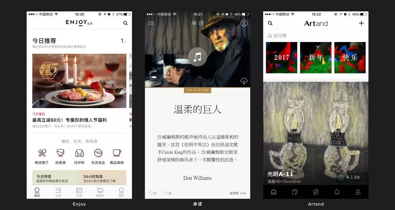 如下图所示我随意截取了九个(其实这样的app我手机里有远不止九个)我自己觉得UI很nice的产品和大家分享,他们分别是Enjoy、单读、Artand、Airbnb、一个ONE、Gilt、良仓、Zeen、和氧气:
