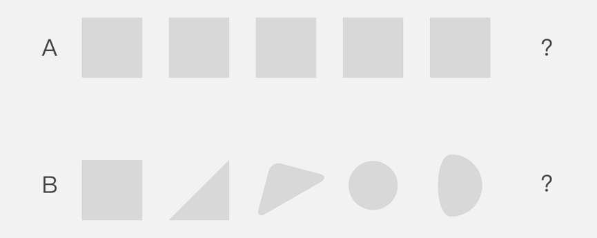 上图A,大家都知道接下来一个一定是正方形,上图B,下一个别说你们不知道是什么,我也不知道。格式塔相似律告诉我们,人们在知觉时,对刺激要素相似的项目,只要不被接近因素干扰,会倾向于把它们联合在一起。