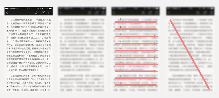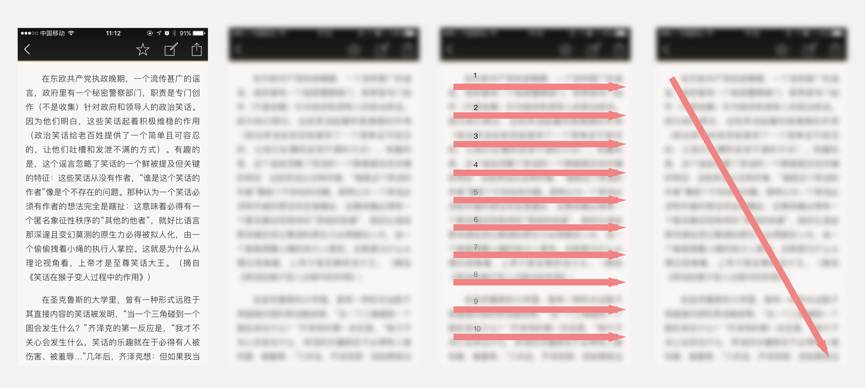 比如上图是一个阅读界面,所有问题都没有特别突兀的地方,所以我们把界面做一个高斯模糊去分析视觉焦点,会发现整个页面呈现很平和,所以,这个页面的阅读顺序应该是一行一行的阅读文字,也就是从上到下,从左到右。