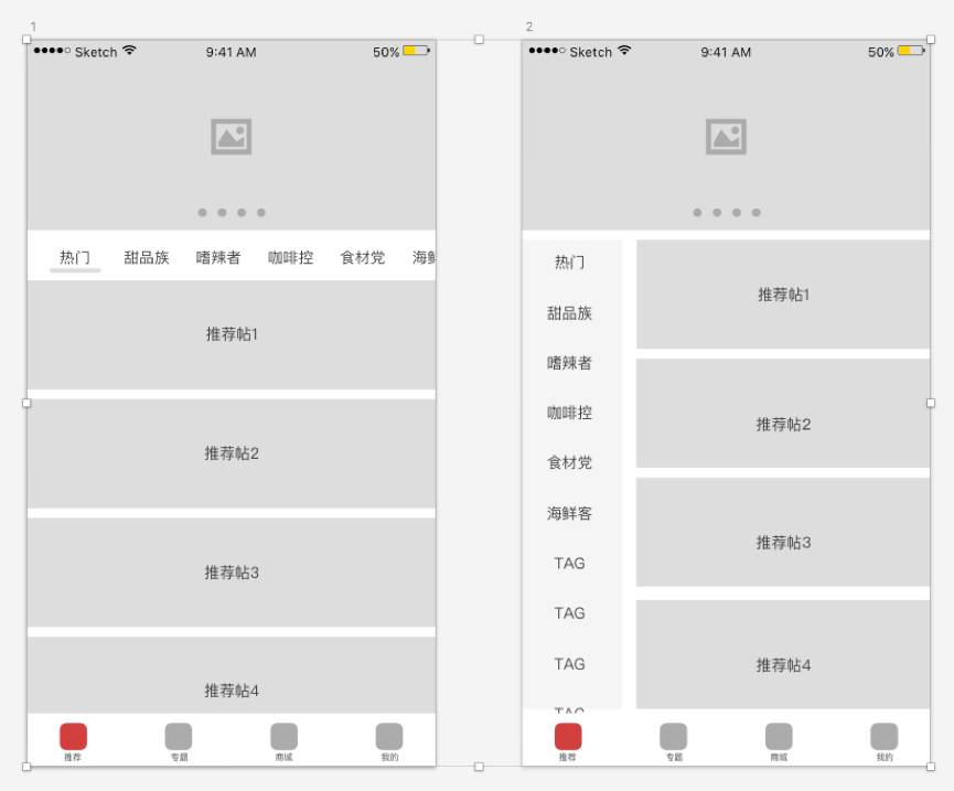 更深层次的,外卖产品之所以用右边这种形式是因为力求一屏展示更多的菜,而且外卖产品的左侧tag一般是一家店铺的菜的品类,用户下滑菜品配合点击品类,点完即走,很方便(京东和淘宝电商类平台也是类似的)。但是比如早期的今日头条只能采用左边的这种形式,因为头条是需要用户长时间沉浸的,比如用户选中一个“体育”的tag一般要看好久好久,用户需要沉浸在这个tag下的内容中,那这个时候显然用右边这种设计方式让tag常驻屏幕左侧是不合适的。