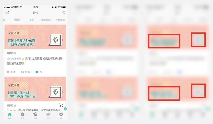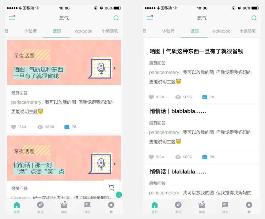 左边是氧气的原UI,右边是我做的对比图。显然,关于文字优化辅助视觉对焦这一点,氧气的设计师显然深谙此道,它们没有按照右边那种传统办法设计这个页面,而是把每一个深夜话题的题目都变成了一张图,变成一张图还不算,还在这张图上面用浅绿色“划了重点”,这样虽然加大了设计师的工作量(其实也还好就是给到话题title换个字出张图而已),但是这个页面正是因为这样的处理,能让用户第一眼聚焦到标题title上: