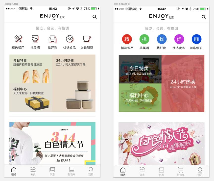 基于以上分析,作为内容+电商平台的“什么值得吃”应该选用左边这种设计形式。